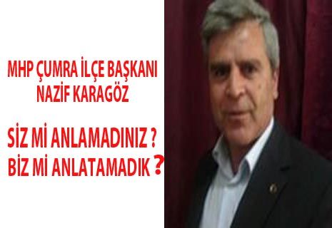 MHP Çumra ilçe başkanı Nazif Karagöz, Ülkemizin geldiği son durum hakkında MHP Genel başkanı Sayın Devlet Bahçeli mi anlatamadı, siz mi anlamadınız ? Yoksa siz mi anlamak istemediniz dedi.