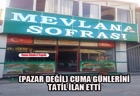 Çumra İzzetbey Mahallesi Yıldız Sokak No. 19'da bulunan Mevlana Etliekmek ve ızgara salonu almış olduğu kararla Cuma günlerini tatil ilan etti.