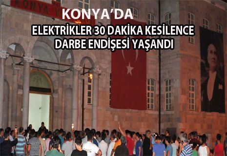 Konya kent merkezinde elektriklerin 30 dakika kesilmesi üzerine darbe olduğunu öne sürerek sosyal paylaşım siteleri üzerinden haberleşen halk ellerine Türk Bayraklarını alarak sokağa çıktı. Valilik binası önünde toplanan yaklaşık 500 kişi, Vali Yakup Canbolat'ın sosyal paylaşım sitesi ‘Twitter' üzerinden ve yetkilil polislerin de sözlü olarak teknik bir arızadan dolayı elektriklerin gittiğini açıklamasına rağmen toplananlar dağılmadı. Vali Canbolat’ın valilik binasına gelmesini isteyen grup, AKP Konya Milletvekili Mehmet Babaoğlu’nun 2 kişiyi vali ile görüştürmesi üzerine halk sessizce dağıldı.