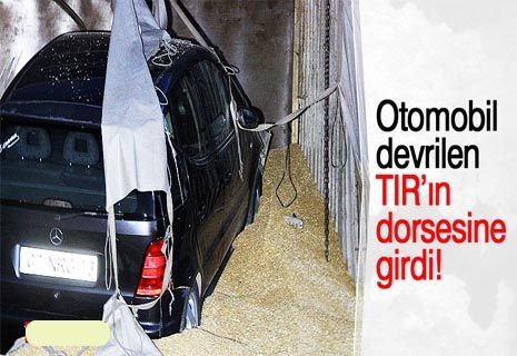 DEVRİLEN TIR'IN DORSESİNE OTOMOBİL GİRDİ.