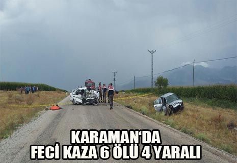 Alınan bilgiye göre, Karaman Merkeze bağlı Mesudiye köy yolunda iki otomobilin kafa kafaya çarpışması sonucu meydana gelen kazada ilk belirlemelere göre 2 si çocuk 6 kişi öldü, 4 kişi de yaralandı. Olay yerine çok sayıda ambulans, sağlık ekipleri ve itfaiye sevk edildi. Yaralılar acil servis ekipleri tarafından Karaman da bulunan çeşitli hastanelere kaldırıldı. Sürücüsü belirlenemeyen 70 AF 930 plakalı otomobilin gelin ve damadın da içinde bulunduğunu kuaföre gitmekte oldukları söylendi. Diğer kaza yapan sürücüsü tespit edilemeyen 42 VL 396 otomobilinde düğün yerine gitmek için hareket halinde oldukları bilgiler arasında olduğu belirtildi.
