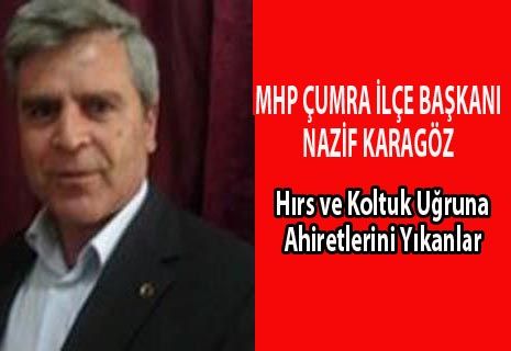 Milliyetçi Hareket Partisi Çumra İlçe Başkanı Nazif Karagöz, Hırs, Makam ve Siyaset uğruna ahiretini yıkanların vay haline dedi.