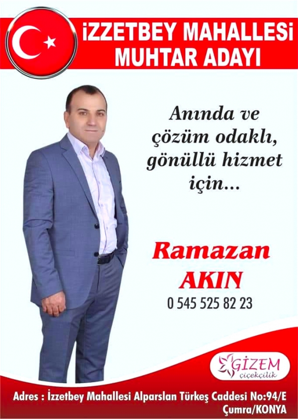 Alparslan Türkeş caddesinde Çiçekçi işletmeciliği yapan dürüst, ilkeli esnaf olan Ramazan Akın 31 Mart 2018 tarihinde yapılacak olan mahalli idareler seçimlerinde İzzetbey mahallesi muhtar adayı oldu.Dürüstlüğü ve güvenilir esnaf olan Ramazan Akın, İzzetbey mahallesine hizmetkar olmak için aday olduğunu, mahalle halkını yakinen çok iyi tanıdığını belirterek beni muhtar olarak seçeceklerinden şüphem yoktur.