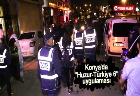 Emniyet Genel Müdürlüğü, Jandarma Genel Komutanlığı ve Sahil Güvenlik Komutanlığı birimlerince 81 ilde 71 bin 531 personelin katılımıyla "Huzur Türkiye" uygulamalarının 6'ncısı gerçekleştirildi. Konya'da da İl Emniyet Müdürlüğü koordinesinde il merkezi ve ilçelerinde eş zamanlı olarak uygulama yapıldı. Uygulamaya güven timleri, çevik kuvvet, yunus timleri, trafik ekipleri başta olmak üzere 500 polis katıldı. İki aşamalı olarak gerçekleştirilen asayiş uygulamasının ilk bölümü saat 20.00'de başladı. Ekipler, şehir giriş-çıkışları ile şehir merkezlerinde önceden tespit edilen hassas noktalarda şüpheli şahıs ve araçlar üzerinde arama, kimlik kontrolü ve plaka sorgulaması gerçekleştirdi. Saat 22.00'de yapılan ikinci uygulamada ise umumi iş yerleri denetlendi. Ekipler, girdiği iş yerlerinde müşteri ve çalışanlarla ilgili de Genel Bilgi Toplama (GBT) sorgulaması yaptı. Toplamda 411 kişinin sorgusu yapılırken, 60 araçta da arama gerçekleştirildi. Yapılan uygulamalarda usulüne uygun çalıştırılmadığı tespit edilen 2 iş yeriyle ilgili tutanak tutulduğu ve başka bir olumsuzluğa rastlanılmadığı öğrenildi.