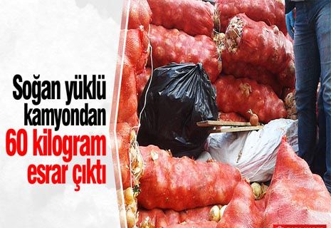 Konya'da soğan yüklü kamyonda 60 kilogram esrar, minibüste 1,5 kilogram eroin ele geçirildi. İl Emniyet Müdürlüğü Uyuşturucuyla Mücadele Şubesi ekipleri, sokak satıcılarına uyuşturucu getirileceği bilgisi üzerine harekete geçti. Konya-Karaman karayolu kent girişinde durdurulan soğan yüklü kamyonda 60 kilogram esrar ele geçirildi, sürücü Kemal A. gözaltına alındı. Antalya-Konya karayolunda bir minibüste yapılan aramada ise 1,5 kilogram eroin bulundu. Minibüsteki Ali K. ile Ali E. gözaltına alındı. Emniyetteki işlemlerinin ardından adliyeye sevk edilen Kemal A, Ali K. ve Ali E. tutuklandı.