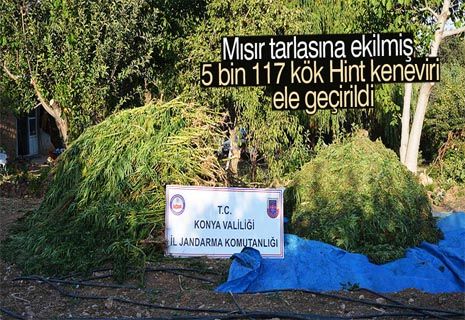 Konya'nın Kadınhanı ilçesinde mısır tarlasına ekilmiş 5 bin 117 kök Hint keneviri ile 225 kilogram kubar esrar ele geçirildi.