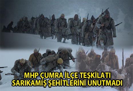Milliyetçi Hareket Partisi Çumra İlçe başkanı Nazif Karagöz, 102 yıl önce Sarıkamış'ta soğuktan donarak şehit olan 90 bin askerimizin şehadetinin 102. yılında rahmetle, minnetle ve dualarla anıyoruz diyerek bir mesaj yayınladı.