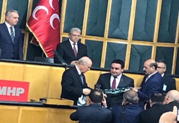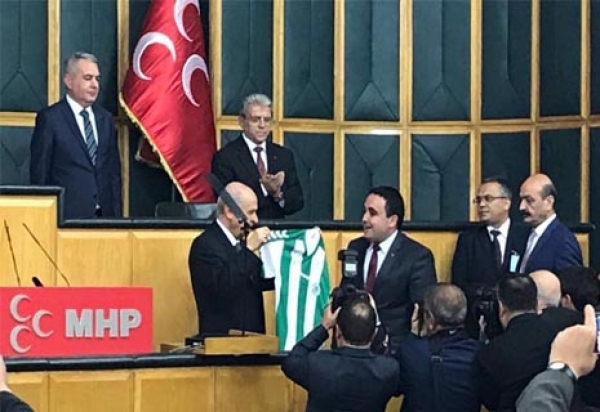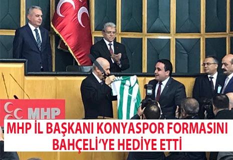 Milliyetçi Hareket Partisi Konya il başkanı Murat Çiçek MHP Genel başkanı Devlet Bahçeli'ye bu günkü grup toplantısında Ziraat Türkiye Kupasını kazanan Konyaspor'un futbolcularının imzası da bulunan formayı hediye etti.