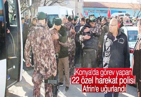 Konya'da görev yapan 22 özel harekat polisi, Zeytin Dalı Harekatı'na katılmak üzere Afrin'e uğurlandı.İl Emniyet Müdürlüğü Özel Harekat Şube Müdürlüğünde görevli 22 polisin Afrin'e uğurlanması dolayısıyla tören düzenlendi.Polislerin aileleri ile Özel Harekat Şube Müdürlüğü yakınında bulunan bir okuldaki öğrencilerin de katıldığı törende, harekata katılacak polisler, aileleri, çocukları ve mesai arkadaşlarına sarılıp vedalaştı.Ellerinde bayraklarla polislere başarı dileyen bazı öğrencilerin de gözyaşlarına hakim olamadığı görüldü.Polisler, dualarla konvoy eşliğinde Afrin'e doğru yola çıktı.