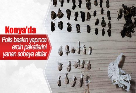 Konya'da polisin bir eve düzenlediği baskın sırasında eroin paketlerini yanan sobaya attığı belirlenen biri kadın 3 şüpheli tutuklandı.