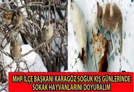 Soğukların etkisini gösterdiği şu günlerde Kedi, Köpek, Kuş ve yaban hayvanlarının çok zor koşullar altında yaşam mücadelesi verdiğini belirten MHP ilçe başkanı Karagöz, Vatandaşların ve belediyenin sokak hayvanlarını doyurması gerektiğini belirtti.