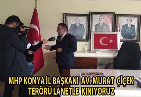 Milliyetçi Hareket Partisi Konya İl Başkanı Av. Murat Çiçek, son günlerdeki terör olaylarından dolayı verdiğimiz şehitlerimize Allah'tan rahmet, ailelerine, Türk silahlı kuvvetlerine ve Yüce Türk Milletine başsağlığı mesajı yayınlayarak, kalleş terör olaylarını lanetle kınıyoruz dedi.