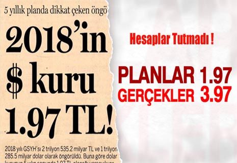 2013 yılında TBMM'ye sunulan 10. Beş Yıllık Kalkınma Programı'da belirlenen hedeflere göre 2018 yılında dolar kurunun 1.97 TL olması öngörülüyordu. Ancak gerçekler pek öyle olmadı. Dolar/TL 3.97'yi aşarak tarihi zirveyi gördü.