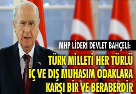 MHP Lideri Bahçeli “Unutulmasın ki, Türk milleti her türlü iç ve dış muhasım odaklara karşı bir ve beraberdir. Hiç kimse, hiçbir güç Türkiye’nin imajını, saygınlığını ve prestijini kıramayacak, tahrip edemeyecektir” dedi.