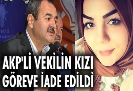 AKP Antalya Milletvekili Hüseyin Samani'nin, adı geçen ay ihraç listesinde yer alan kızı dün yayınlanan KHK ile işe iade edildi. Resmi Gazete'de yayımlanan son KHK ile görevine iade edilen 57 kişi arasında kızı da bulunan Samani, ''Kızım daha öncesinden istifa etmişti, göreve başlamayacak. Mesele göreve başlama meselesi değil zaten'' dedi.