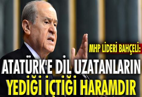MHP Genel Başkanı Bahçeli, "Aziz Atatürk'e iftira atanların yediği içtiği haram, esip savurduğu haysiyetsizliktir. Asılsız ve alçakça ithamlarla cumhuriyetimizin kurucusu Atatürk'ü gözlerden ve gönüllerden düşüreceklerini sanan varsa, ya zekaları kurumuş ya da insanlıkları kaybolmuştur." dedi.