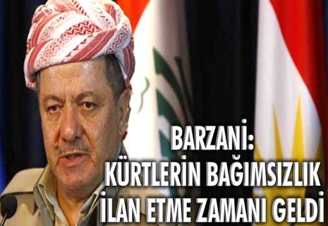 PEŞMERGEBAŞI Mesut Barzani, Irak'ta bağımsız Kürt devleti kurmanın zamanının geldiğini iddia etti. 'Irak'tan barışçıl bir şekilde diyalog ve müzakere yoluyla ayrılmak istiyoruz " diyen Barzani, komşularla iyi geçinmek istediklerini bildirirken, bağımsızlığın yeni sorunlar çıkartmayacağını aksine sorunların çözümüne yardımcı olacağını ileri sürdü.