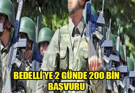 BEDELLİ askerlik uygulamasından yararlanmak için iki gün içinde 200 bine yakın başvuru yapıldı. Milli Savunma Bakanı Hulusi Akar, "Hedefimiz gençlerimizin bedelli askerlik uygulamasından en kısa zamanda ve sorunsuz bir şekilde yararlanmasını sağlamak" dedi.