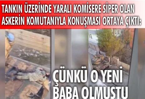GEÇTİĞİMİZ günlerde, Şırnak'ın Cizre ilçesinde bölücü terör örgütü PKK'lılarla güvenlik güçleri arasında çıkan çatışmada bir özel harekat komiseri yaralandı. 3 çocuk babası polis çatışma bölgesinden bir tank üzerinde uzaklaştırılırken bir asker ise üzerine yatarak siper oldu. Asker, birliğine geri döndüğünde tabur komutanı tarafından çağırıldı. Tabur komutanıyla kahraman asker arasında geçen konuşma son derece duygulandırıcıydı.