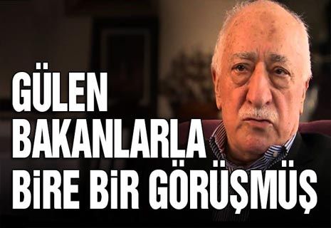 AKSU, ÇİÇEK, ŞAHİN: Gülen her toplantıya katılmıyordu. Ancak kendisine ayrılmış olan bölümde özel görüşmek istediği devlet erkanı, asker, polis, yargı ve MİT'te görevli cemaat mensupları ile görüşüyordu. Gülen'in bire bir görüştüğü bakanlar Cemil Çiçek, Refaiddin Şahin, Abdülkadir Aksu idi.