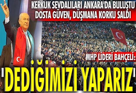 BAHÇELİ, Kerkük'ün güvenliğinin Ankara'nın güvenliği olduğunu belirterek, "Türkmeneli ateşe atılırsa Türkiye de yanmaktan kurtulamayacaktır. Gerçekler bu kadar acı ve alarm verici boyuttadır. Her minnete katlanıp, her melaneti göğüsleyip mütecaviz emelleri kaynağında kesmek şarttır, fitneyi odağında kurutmak Türk devletinin en tabii hakkı, ertelenemez görevidir. Biz Türkmenelini son nefesimize kadar, tıpkı son vatanımızı olduğu gibi, savunacağız, sahipleneceğiz, şerefsizlerin ambargosuna, egosuna, pis emellerine bırakmayacağız" diye konuştu.