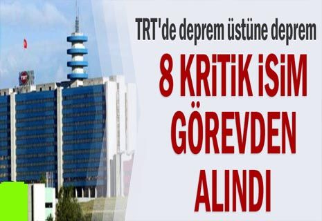 TRT'de geçen hafta Şenol Göka'nın genel müdürlükten istifasının ardından dün de 8 daire başkanının görevden alındığı öğrenildi. TRT Genel Müdürü Şenol Göka geçen hafta görevinden istifa etmişti. Göka'nın istifa dilekçesinde, 'gördüğüm lüzum üzerine istifa ediyorum' ifadeleri yer almıştı.